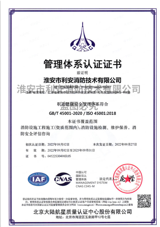 淮安市利安消防技术有限公司成立于二0一0年,目前满足2019年8月29日,应急管理部颁布《消防技术服务机构从业条件》,已在江苏消防网注册备案,可以从事消防设施的检测、维修保养、消防评估,且取得江苏省建委颁发的消防设施工程专业承包贰级资质证书,可从事消防设施安装。